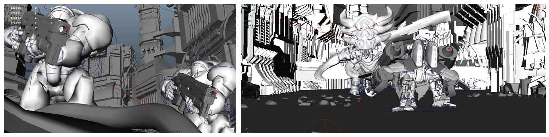 在特效环节,我们使用了MAYA和3DSMAX同时完成,但因为全片的模型动画镜头全都是在MAYA中完成,所以在软件交互上遇到了一些困难,我们便试着在后期软件上弥补,将镜头导入到后期软件中进行合成。